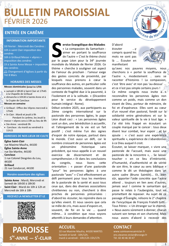 À la suite de l’accident survenu le jeudi 29 janvier 2026 dans l’église Sainte-Anne, celle-ci reste inaccessible jusqu’à nouvel ordre de la mairie de Nantes. Nous mettons tout en œuvre pour que cette fermeture ne se prolonge pas inutilement.